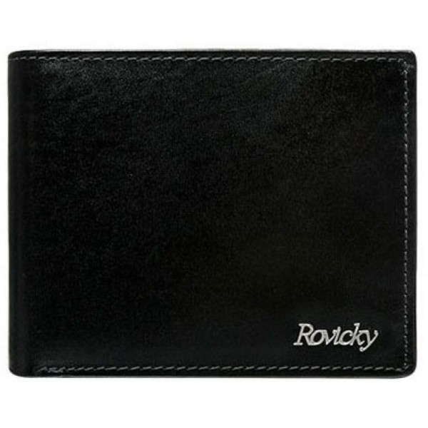 Kožni muški novčanik, vrlo elegantan, crne boje sa natpisom "Rovicky". Novčanik ima dosta mesta za kartice, dokumenta, džep za sitan novac, mesta za papirni novac i jedan odeljak osiguran rajsferšlusom. Dimenzije 13x9x3cm.